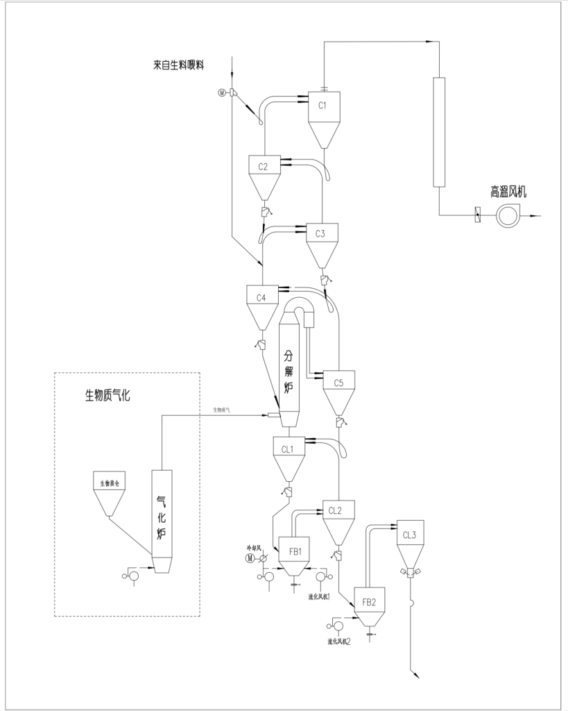 此外,维持生物质气化系统的高效运行,需要设置烘干机,降低生物质含水量。悬浮煅烧系统后可以设置余热锅炉,产生蒸汽,为烘干机提供热源。锅炉排烟作为粉磨系统烘干热源使用,提高整体能源利用率。